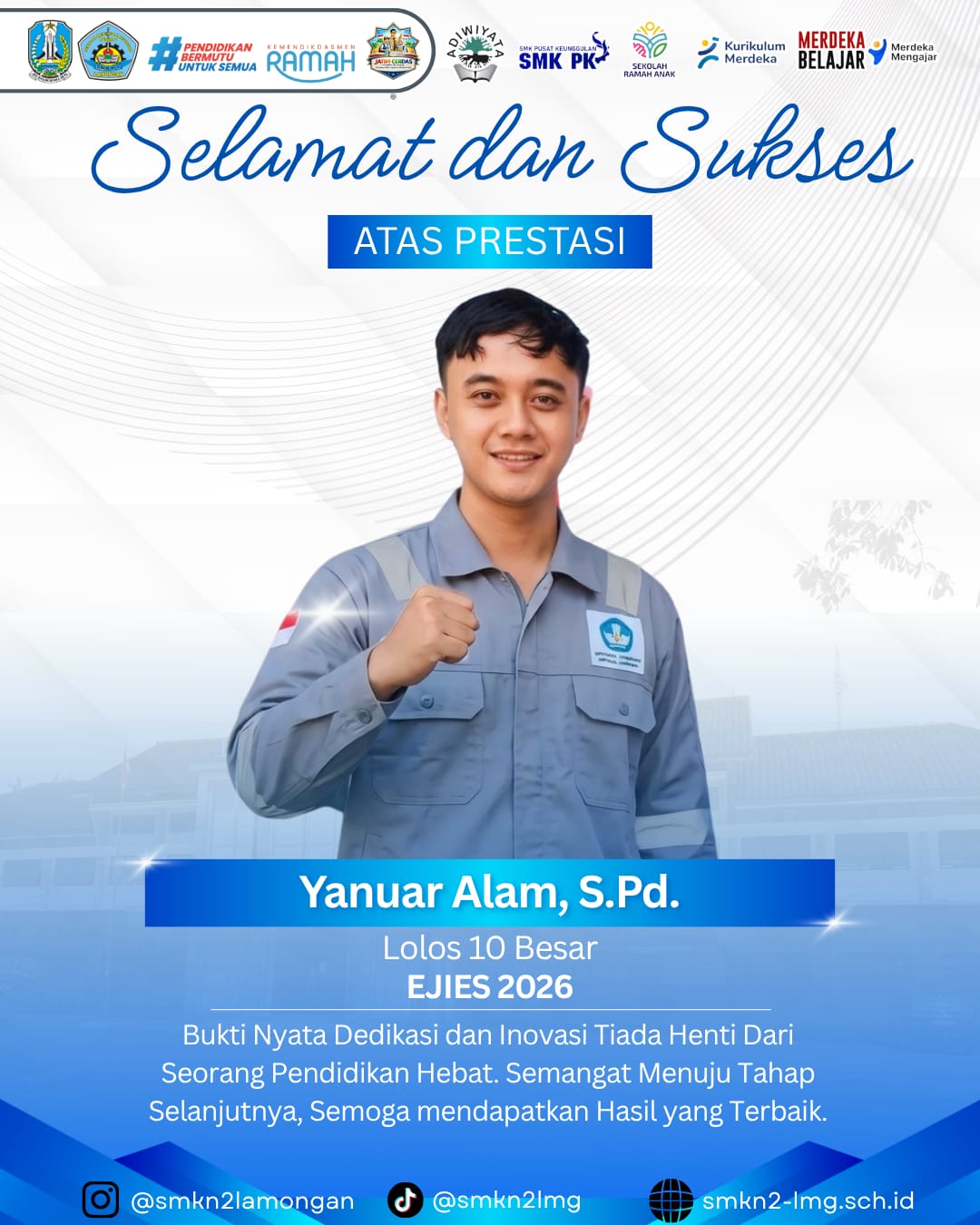 Keluarga besar SMK Negeri 2 Lamongan mengucapkan Selamat kepada Bapak Yanuar Alam salah satu guru Kompetensi Keahlian Teknik Kendaraan Ringan SMK Negeri 2 Lamongan atas prestasinya lolos 10 besar EJIES 2026.
