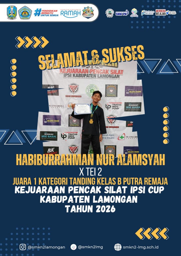 Habiburrahman Nur Alamsyah Kelas X TEI2 mendapat Juara 1 Kategori Tanding Kelas B Putra Remaja dalam Kejuaraan Pencak Silat IPSI Cup Kabupaten Lamongan Tahun 2026. Kegiatan berlangsung pada hari selasa, 17 Februari 2026.