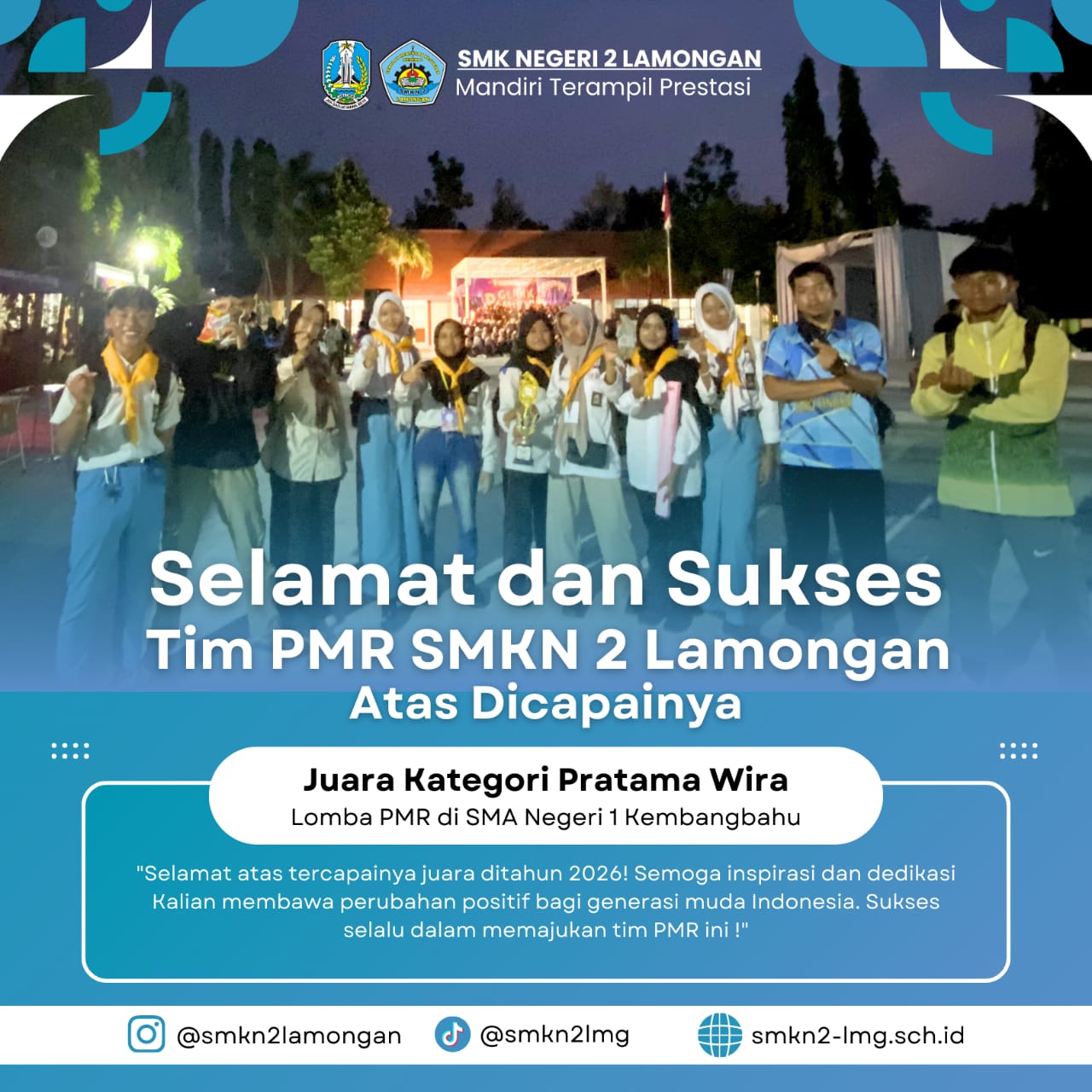 “Selamat atas tercapainya juara di tahun 2026, semoga inspirasi dan dedikasi kalian membawa perubahan positif bagi generasi muda indonesia. sukses selalu dalam memajukan tim PMR ini!”